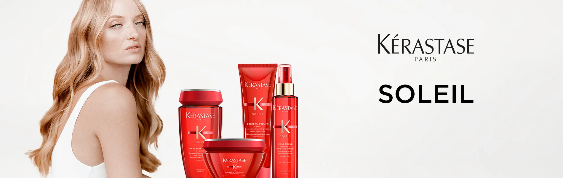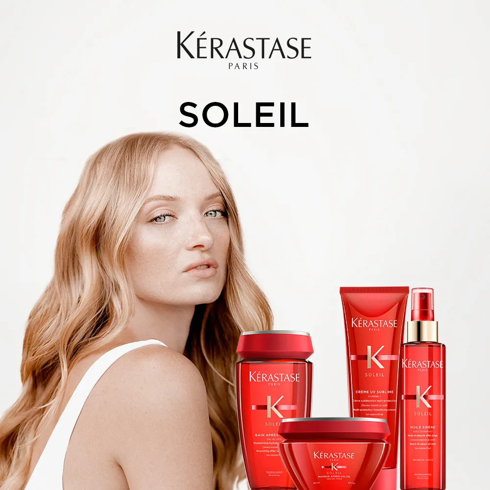 Kérastase Soleil ist ein Schutz- und Pflegeprogramm für sonnenstrapaziertes Haar. Die Produkte sind abgestimmt um vor, während und nach dem Sonnenbad angewendet zu werden. Damit wird das Haar ideal vor UV-Strahlung, Salz, Chlor und mechanischen Einflüssen geschützt.