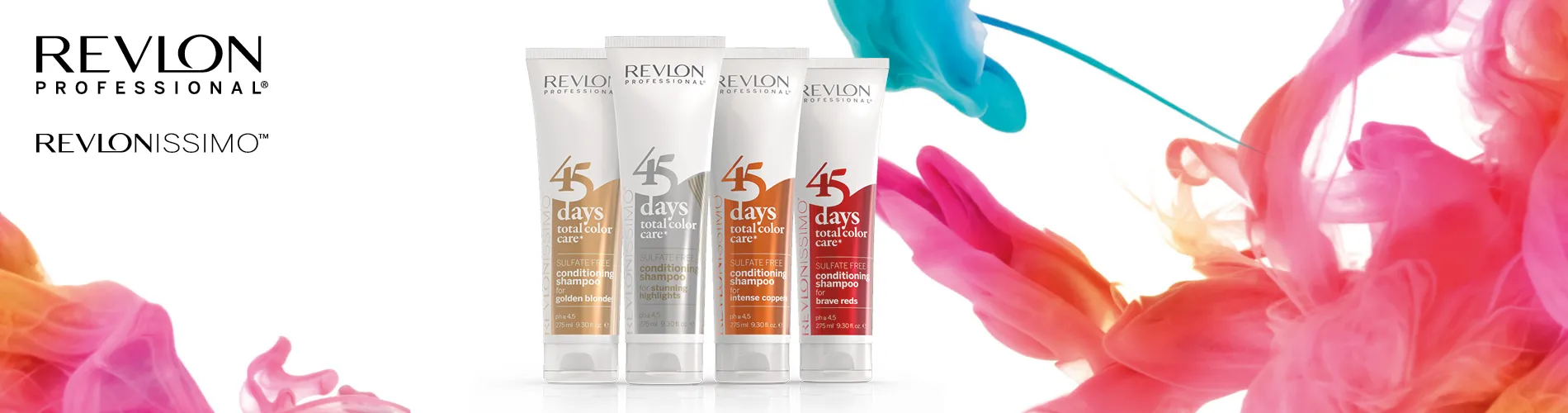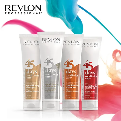 Das sulfatfreie Revlon Farbshampoo aus der Revlonissimo 45 Day Serie von Revlon Professional bietet Schutz gegen Farbverlust und hilft, die Zeit bis zum nächsten Farbservice zu überbrücken. Die Total Color Care Serie hilft, die Pigmente in der Haarfaser wieder aufzufüllen. Es ist je nach Haarfarbe in verschiedenen Varianten erhältlich.